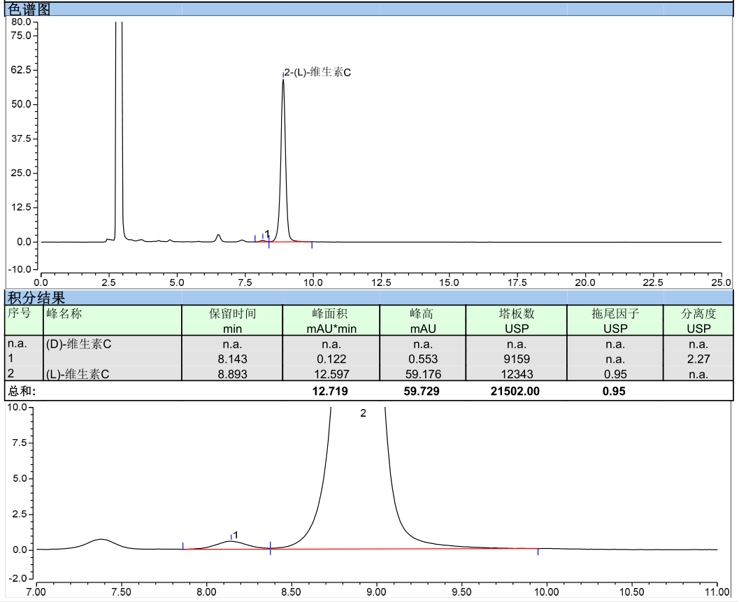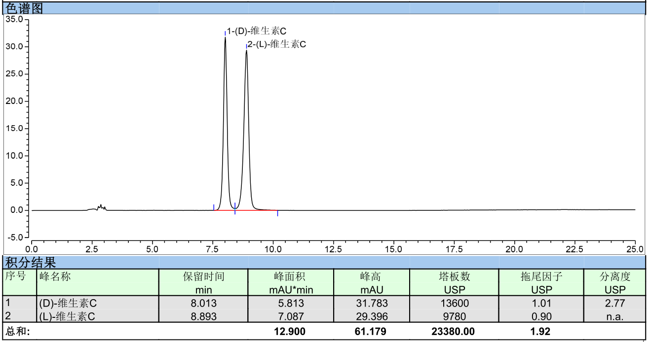 使用JADE-PAK KP-NH2 5μm 4.6×250mm色谱柱测试维C银翘片中维生素C的含量测定,对照品溶液和供试品溶液的维生素C目标峰塔板数均大于2000,并成功分离(L)-维生素C和(D)-维生素C异构体。